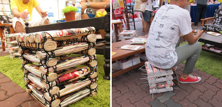 Para criar esse banquinho também é preciso enrolar as revistas – tente controlar o número de páginas para obter pares de revistas que tenham mais ou menos a mesma espessura. Prenda os rolos com corda, barbante, lacres plásticos, ou o que você tiver em casa! Em seguida, empilhe-os como se fossem madeira! No fim você terá um banquinho maneiro que pode ficar ainda melhor se utilizada uma almofada!