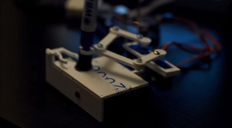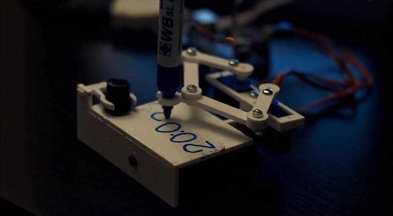 Operado por um arduíno – placa que permite automação de projetos eletrônicos – e com componentes impressos em impressora 3D, esse relógio escreve as horas em uma espécie de lousa! Assim que a caneta, conectada a um braço mecânico, termina de escrever, ele apaga os dígitos e começa novamente.