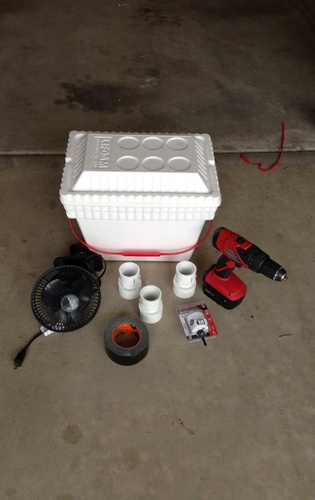 Veja abaixo as etapas da produção do ar condicionado caseiro proposto por Rory. O passo a passo é bastante simples e pode ser concluído em menos de uma hora!1. Separe os materiais: o nosso condicionador de ar vai nascer com a cuidadosa junção de uma caixa térmica de isopor, um conector de PVC (2 polegadas de diâmetro) e um pequeno ventilador. Além disso, o processo de produção pode envolver uma furadeira (ou uma faca), fita adesiva e cola – dependendo de sua habilidade de encaixar os materiais.