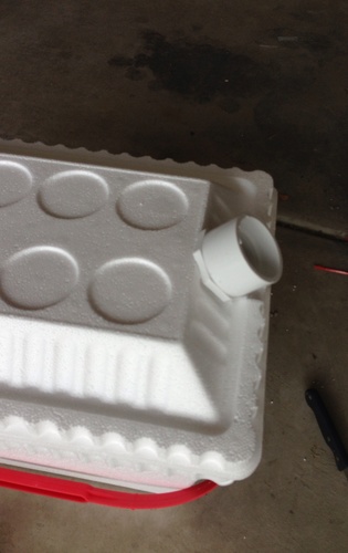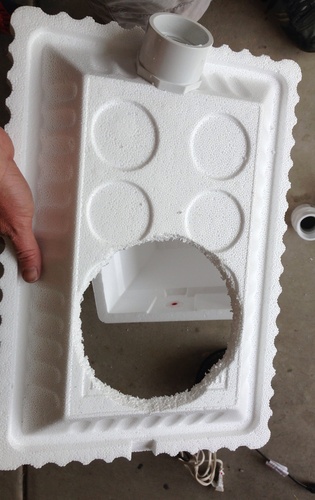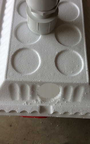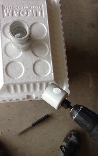 2. Vamos furar o isopor: faça um furo na parte superior da caixa de isopor usando uma furadeira com serra do mesmo diâmetro que o tubo de PVC. É possível também usar uma faquinha ou estilete.