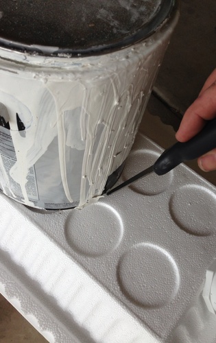 4. O segundo furo: agora chegou a vez de fazer um furo para encaixar o ventilador. No caso da imagem acima, a lata de tinta foi usada para demarcar a região do corte. Meça o seu ventilador e encontra um modo de cortar a tampa da caixa de isopor. Faça um furo pelo menos um centímetro menor nas bordas para garantir o encaixe.