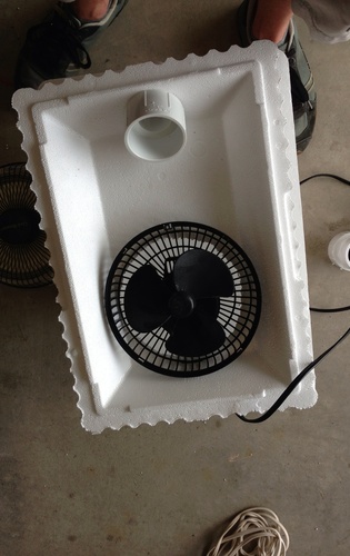 5. Instalando o motor: coloque o ventilador por dentro da tampa e fixe-o com fita adesiva. Ele será o motor do nosso ar condicionado e deverá soprar para dentro de modo que o ar passe pelo interior da caixa e saia pelo cano de PVC.